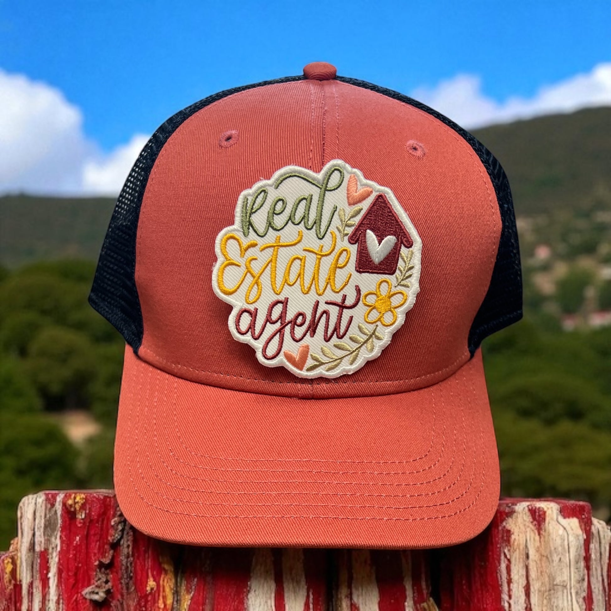 Whether you're closing deals or cruising open houses, this hat means business — the stylish kind. Featuring a bold "Real Estate Agent" patch front and center, this salmon and navy trucker brings the perfect pop of personality to your professional hustle. The breathable mesh back keeps you cool while you’re heating up the market, and the adjustable snapback ensures it fits just right (even on big decision days).